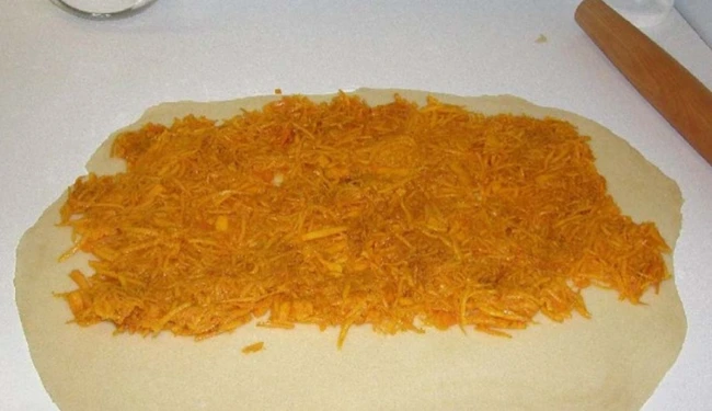 Ingrediente: 500 gr. dovleac dat pe răzătoare mare, 500 gr. de zahăr, ½ l ulei, ½ kg făină, 1 linguriţă sare, o ceaşcă cu apă călduţă. Se pune făina, 3 linguri de ulei, 1 linguriţă sare şi ceaşca cu apă călduţă. Se face un aluat fraged care se împarte în trei, se lasă 10 - 15 minute acoperit. Se unge tava cu ulei, se ia o bucată de aluat, se întinde cât se poate de subţire, iar marginile groase se rup, se aşează aluatul pe un prosop pentru a se putea rula mai uşor şi mai bine. Pe foaia bine întinsă se aşează a treia parte din dovleac cu zahăr şi ulei (toate se pun în mod egal pe întreaga suprafaţă apoi plăcinta se rulează cu ajutorul prosopului şi se aşează în tavă). Se procedează la fel şi cu celelalte două părţi rămase. Se dă la cuptor la foc potrivit 25 – 30 minute. După coacere se scoate tava, se acoperă cu un prosop şi se lasă 10 minute, după care se pudrează cu zahăr fin, se taie şi se serveşte fie caldă fie rece.