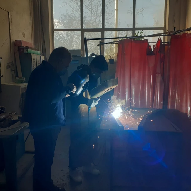 Sunt elevi din patru grupe, care se rânduiesc pentru fiecare operaţiune în parte. Mai mulţi băieţi se înghesuie să sudeze, ceea ce pare una dintre operaţiunile cele mai râvnite.