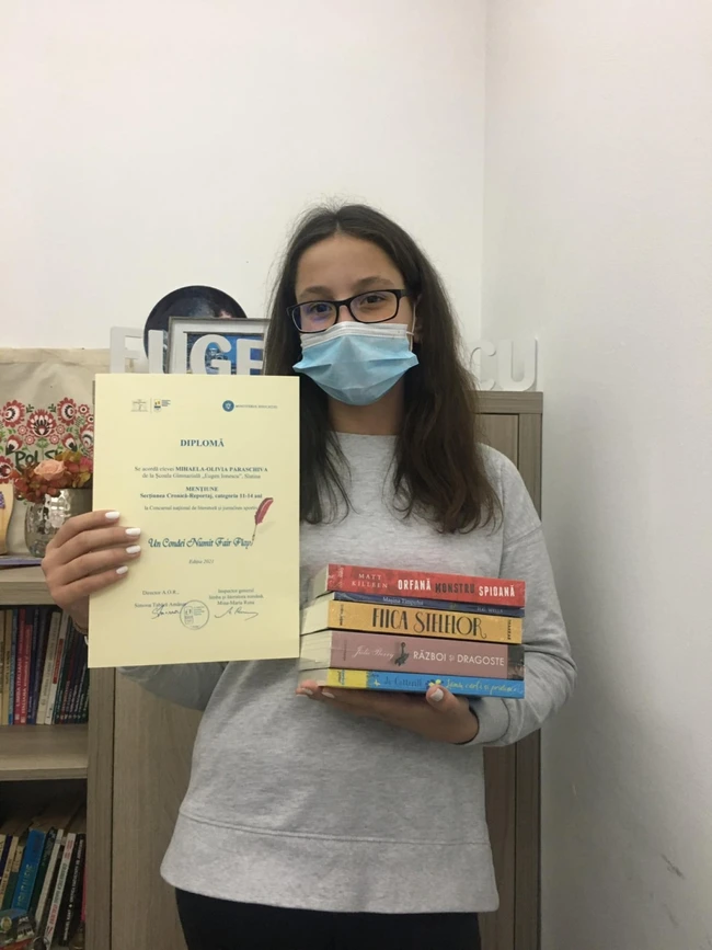„Nu este primul premiu luat. Am obţinut premiul II la naţională, cu Nadolu Maria şi Filişanu Andrei, colegii mei. A fost un concurs pe echipe, au fost două faze, ne-am calificat, după am fost la naţională. După care am auzit şi de acest concurs care mie mi-a plăcut foarte mult şi m-am gândit să fac cronică pentru că, nu ştiu, mi-a plăcut să vorbesc despre viaţa Nadiei Comăneci, care este un model pentru mine“, a dezvăluit eleva.