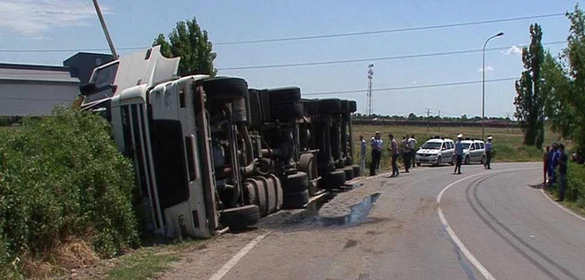S-a răsturnat cu tirul încărcat cu lemne într-un şanţ la Strejeşti-Olt