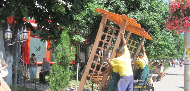„Vom monta 27 de pergole din lemn. Sperăm să finalizăm până deseară”, spune unul dintre lucrători.