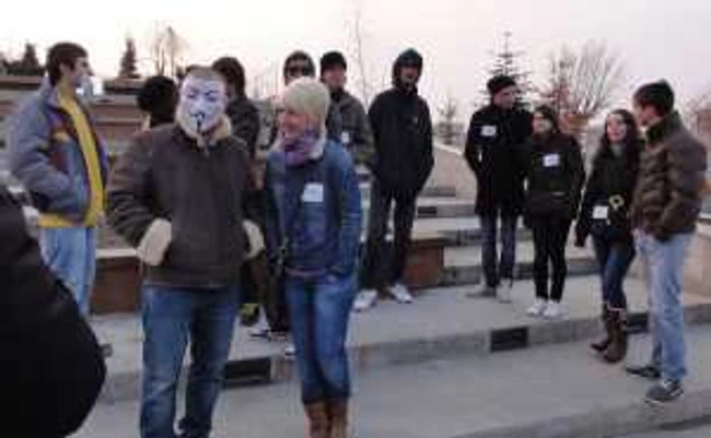 La mişcarea de protest planificată a avea loc pe esplanadă începând cu orele 17.00 au participat efectiv un număr infim faţă de câţi anunţaseră că vor veni pentru a-şi exprima opinia faţă de ACTA. Purtând pe faţă măşti de hârtie sau din plastic inspirate din filmul “V for Vendetta”, dar şi stikere lipite pe gură pe care era înscris cuvântul “ACTA”, participanţii - deşi puţini – au protestat în mod paşnic.
