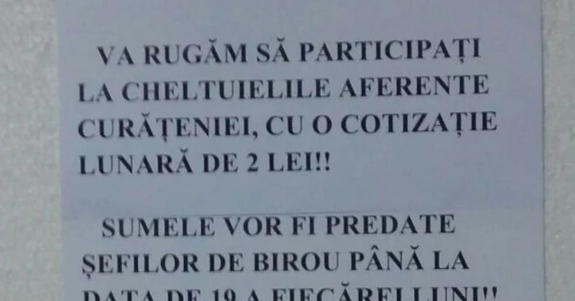 Un asemenea anunţ am primit de la cetăţenii din Slatina care au fotografiat panoul din holul Poliţiei Slatina unde scria negru pe alb şi cu mai multe semne de exclamare că poliţiştii sunt „rugaţi” să decarteze 2 lei şefilor pentru plata lunara a curăţeniei. Nu discutăm aici de valoarea modică a sumei, ci de principii. De faptul că poliţiştii, în calitate de angajaţi, susţin financiar funcţionarea sistemului. Ne întrebăm cum ar fi dacă spre exemplu conducerea unui supermarket ar începe să le ceară angajaţilor sume de bani pentru a face curăţenie în magazin printre rafturi sau pentru a plăti diferite alte servicii?!