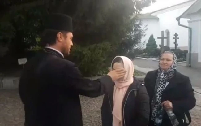 VIDEO Credincioşi plesniţi peste ochi cu aghiasmă în curtea mănăstirii. „Tehnica“ violentă a unui preot român, admirată de privitori