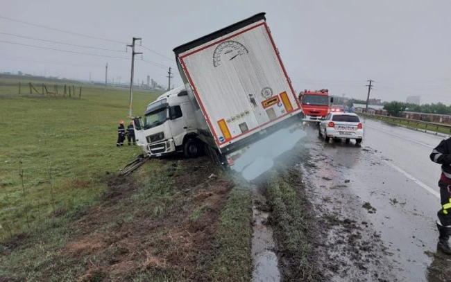 Astăzi, în jurul orei 08.50, pomăierii au fost solicitaţi să intervină la un accident rutier produs pe raza municipiului Urziceni, pe DN2, în care a fost implicat un camion care s-a răsturnat în afara părţii carosabile.