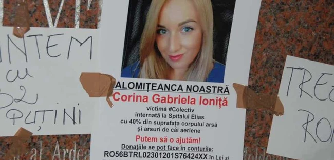 0Pe reţeaua de socializare Facebook a fost creată o pagină dedicată Corinei Gabriela Ioniţă, tânăra rănită în incendiul din Clubul Colectiv. Duminică seara ea a fost transferată la un spital din zona Essex, Marea Britanie. Corina a suferit arsuri de peste 40 % din suprafaţa coruplui şi se află în stare stabilă.