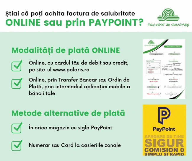 Serviciul de plată online, disponibil pe site-ul https://www.polaris.ro. Click aici pentru a accesa ghidul: https://sloboziail.ro/img/Ghid-Plata-Polaris.jpg Serviciul de plată prin PayPoint este disponibil în toate magazinele cu sigla PayPoint.