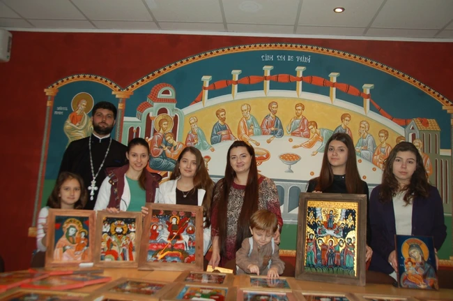 Într-o sală mare şi luminoasă, aşezate unele lângă altele se aflau icoanele pe lemn şi sticlă pictate de copii. Ca şi în ceilalţi ani, fiecare va dărui apropiaţilor una dintre icoanele pe care le-au realizat. Este o tradiţie pe care o păstrează cu sfinţenie în preajma Paştelui. Mezina grupului este Mălina Olăreanu şi are 9 ani. Ea a decis ca icoana pe care a pictat-o s-o ofere mamei sale.