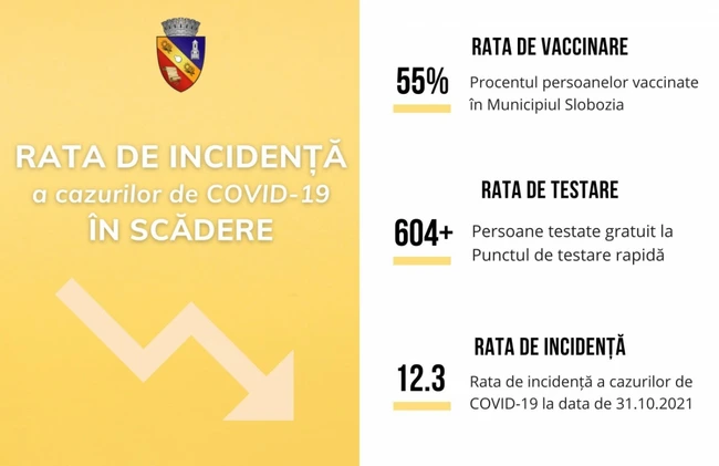 0Conform datelor oficiale, rata de incidenţă a cazurilor de COVID-19 în Municipiul Slobozia a scăzut la 12.3 l/ 1000 de locuitori, vârful fiind de 14.06 /1.000 de locuitori, în dat de 27 cctombrie 2021.
