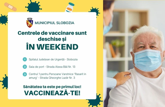 0Trei centre de vaccinare din municipiul Slobozia sunt deschise şi în weekend pentru cei care aleg să se imunizeze împotriva COVID-19.