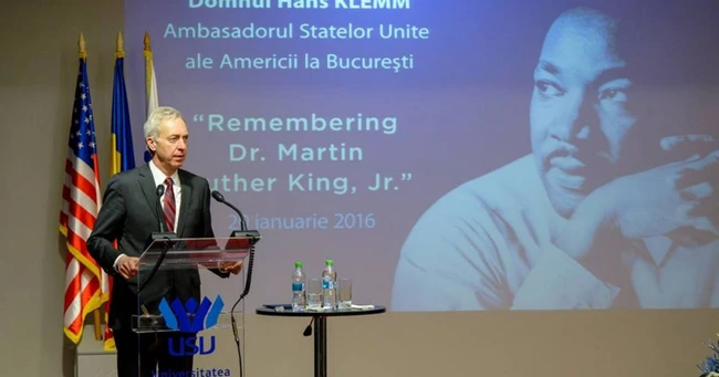 „Aici, în România, anul trecut, la începutul lunii noiembrie, cu doar câteva luni în urmă, am fost martor unor lucruri de care cred că Martin Luther King Jr ar fi fost foarte mândru. Zeci de mii de oameni s-au adunat în toată ţara în mod paşnic pentru a cere schimbarea, aşa cum ne învaţă moştenirea lui Martin Luther King Jr să facem. Am fost impresionat îndeosebi de pasiunea tinerilor care îşi doresc un viitor mai bun, unul în care statul de drept triumfă şi lupta împotriva corupţiei este regula. Sper că acei protestatari şi alţi oameni vor mărşălui din nou către secţiile de votare atunci când va sosi momentul să-şi exercite puterea supremă, votul, pentru a alege persoane care vor fi lideri responsabili ai acestei naţiuni şi conducători ai cetăţenilor săi. Permiteţi-mi să închei cu unul dintre citatele mele favorite din Martin Luther King Jr: <<Credinţa înseamnă să faci primul pas chiar dacă nu vezi întreaga scară>>. Cred că România a făcut recent un pas imens către un viitor extraordinar şi, deşi nu putem vedea ce se află înainte, am deplină încredere în cetăţenii acestei măreţe ţări în acest an electoral şi în dorinţa lor de a avea un guvern care să-i slujească bine”, a declarat ambasadorul Hans Klemm.