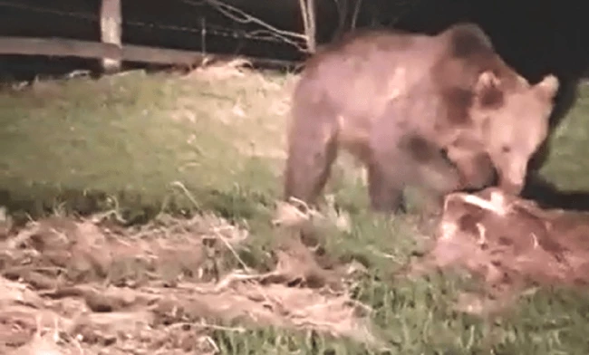 Un urs adult a fost filmat în timp ce mânca un viţel de pe raza comunei Pojorâta a judeţului Suceava. Localnicii spun că nu este pentru prima dată când sălbăticiunea a coborât din pădure în sat, pentru a căuta hrană.