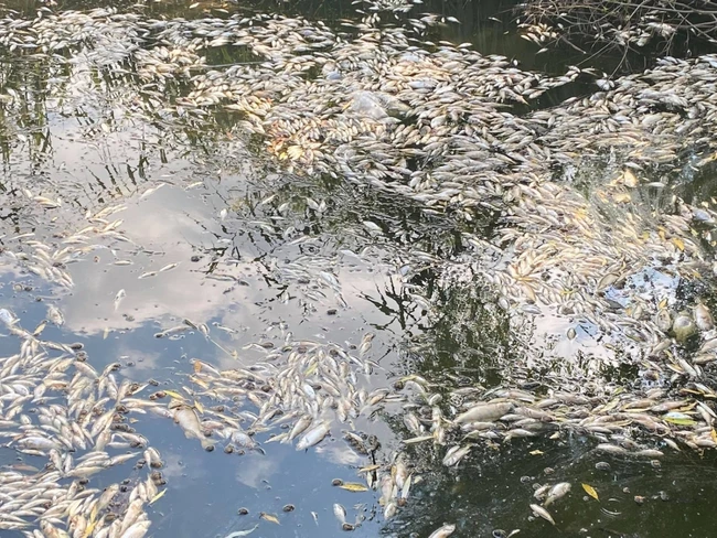 A găsit astfel mii de peşti morţi, unii în putrefacţie, plutind la suprafaţa apei. A făcut câteva fotografii pe care le-a publicat pe un grup de Facebook.