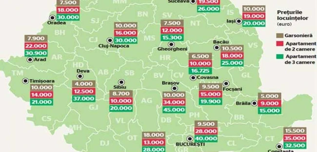 Cu 10.000 de euro se poate cumpăra o garsonieră atât în Braşov, cât şi în Iaşi. În cazul locuinţei din Iaşi, aceasta are o suprafaţă de 17 metri pătraţi. Cele mai ieftine locuinţe de două camere sunt în Covasna şi în Brăila. Aşadar, apartamentul din Covasna costă 10.000 de euro şi are o suprafaţă de 50 de metri pătraţi. O oferta şi mai bună vine din Brăila, unde o locuinţă de 35 de metri pătraţi executată silit de Raiffeisen Bank este scoasă la vânzare la prima licitaţie la un preţ de strigare de 9.000 de euro.