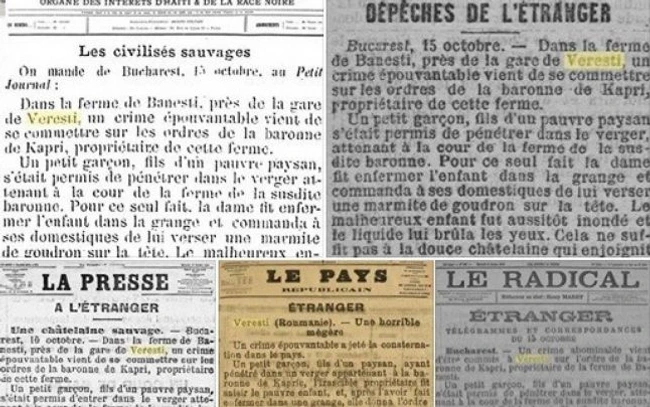 „La moşia din Băneşti, aproape de gara Vereşti, o crimă teribilă tocmai s-a comis, din ordinele baronului Kapri, proprietarul acestei moşii. Un copilaş, fiul unui biet ţăran, a îndrăznit să intre în livada învecinată curţii susnumitului baron. Doar pentru aceasta, doamna a încuiat copilaşul în hambar şi a poruncit slugilor să-i verse o găleată cu gudron în cap. Nefericitul copilaş a fost orbit de lichidul care i-a intrat în ochi. Aceasta nu a fost suficient pentru ignobila stăpână, care le-a cerut, apoi, slugilor să înmoaie copilul în smoală dizolvată, din cap, până în picioare, şi să-i dea foc. Această ultimă poruncă, după ce au fost executate cele anterioare, au fost refuzate de slugi, care nu au avut putere să-l supună pe bietul copilaş şi acestui ultim supliciu”, se arată pe blogul lui Ion Drăguşanul.