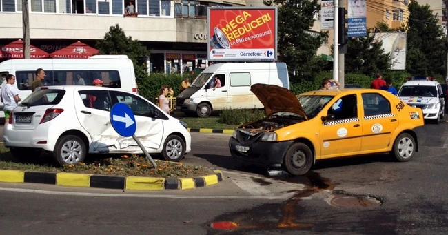 Un accident rutier s-a produs sâmbătă după-amiază, în jurul orei 17.00, în intersecţia bulevardelor George Enescu şi Calea Obicinilor din municipiul Suceava. Un taximetrist s-a izbit violent într-un autoturism Toyota Yaris, la volanul căruia se afla o femeie, care ieşise din parcarea unui supermarket pe culoarea roşie a semaforului.