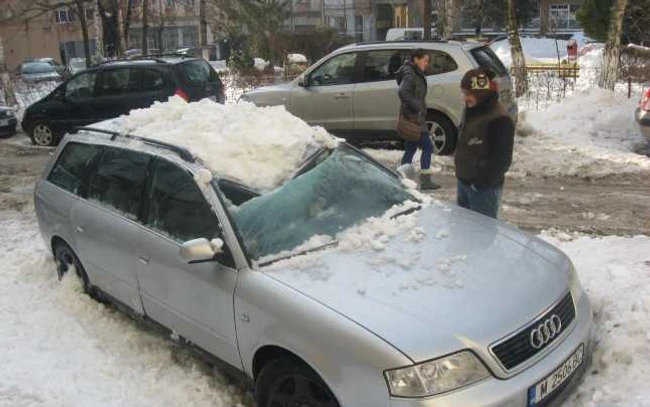 Mai multe maşini din municipiul Suceava au fost distruse în proporţie mai mare sau mai mică după ce peste ele a căzut zăpadă de pe acoperişurile blocurilor.