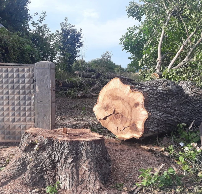 Întâi m-am dus la vecini şi i-am întrebat de ce nu m-au anunţat. Mi-au spus că muncitorii le-au spus că nucul a fost tăiat cu acceptul proprietarului. Nici vorbă de aşa ceva. Pe urmă m-am dus la Poliţie şi au depus o plângere pentru tăiere ilegală, violare de domiciliu şi distrugere. Apoi, am fost la Garda de Mediu, Garda Forestieră, Direcţia Agricolă. La Direcţia Agricolă mi s-a spus că nu există nicio autorizaţie pentru tăierea nucului”, a declarat proprietara.