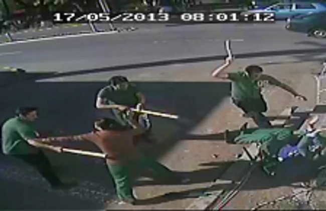 După cum se vede pe imaginile surprinse pe o cameră de supraveghere instalată la un magazin din centrul oraşului, cei doi soţi au fost atacaţi de trei indivizi înarmaţi cu bâte de baseball. Ţinta era bărbatul, care a fost doborât de lovituri şi pus la pământ. La un moment dat, soţia sa a intervenit şi i-a fugărit pe agresori cu un bolovan.