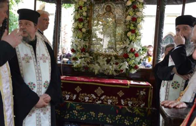 Racla a fost urcată într-o maşină şi a fost plimbată pe la mai multe biserici din oraş. Arhiepiscopia Sucevei şi Rădăuţilor le-a cerut parohilor să stea la biserici şi să tragă clopotele în timp ce racla se află în procesiune.