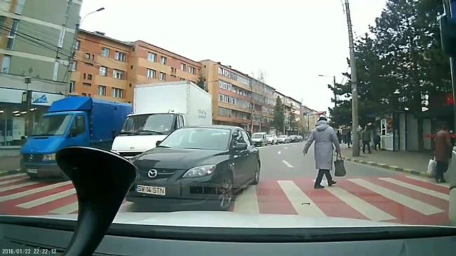 În imaginile surprinse vineri, 12 aprilie, se vede cum un autoturism Mazda, cu numărul de Suceava, trece peste linia dublă continuă, depăşeşte o întreagă coloană de maşini oprită la trecerea de pietoni, şi aproape că loveşte o femeie care traversa strada în mod regulamentar.