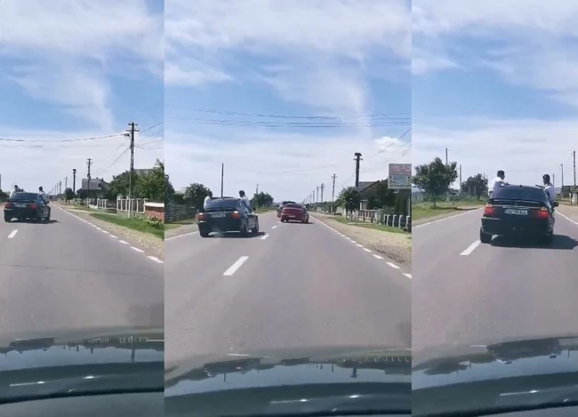 Înregistrarea video în care apar cele trei maşini, care circulă haotic, pe DN2, în localitatea Bădeuţi a judeţului Suceava, a fost publicată pe grupul de Facebook ”Atenţie Poliţia”, fiind însoţită de comentariul: „Acel moment când cobori din căruţă şi urci în BMW pentru prima oară”.