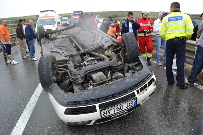 VIDEO Trei răniţi după ce o maşină s-a răsturnat pe un pod de pe DN17