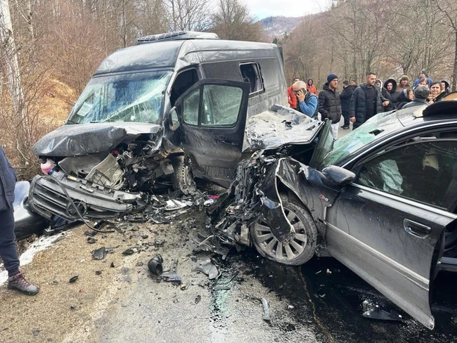 Accident cu 9 răniţi pe DN 71 Sinaia - Târgovişte. O maşină ar fi pătruns pe contrasens şi s-a izbit de un microbuz