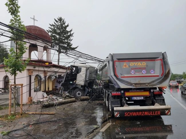 Accident mai puţin obişnuit în Dâmboviţa. Un TIR a intrat direct în capela unei biserici VIDEO
