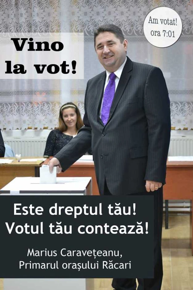 Cel mai vrednic primar din Dâmboviţa este primarul oraşului Răcari, Marius Caraveţeanu, care a ţinut să posteze pe Facebook acest lucru. A votat la ora 07.01.