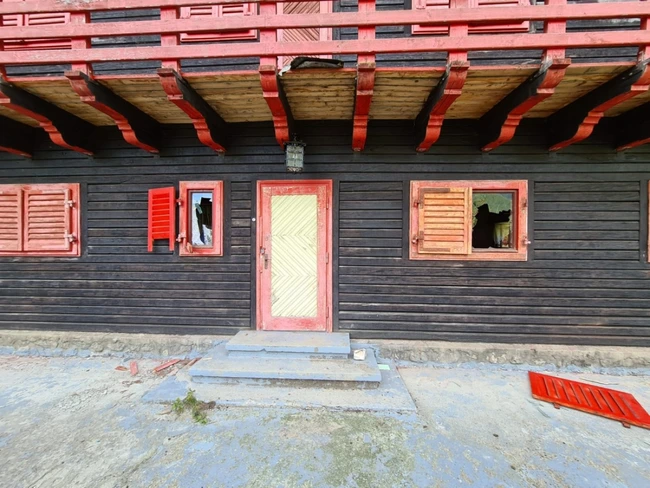 Pe pereţii cabanei se vad urmele ursului iar în interior sunt urme de sânge, semn că s-a tăiat în geamul spart, în momentul in care a pătruns în cladire.