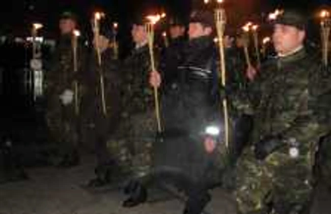 Ploaia deasă şi rece nu i-a împiedicat pe militarii din Garnizona Târgovişte să pornească pe străzile din inima Cetăţii ceremonialul retragerii cu torţe.