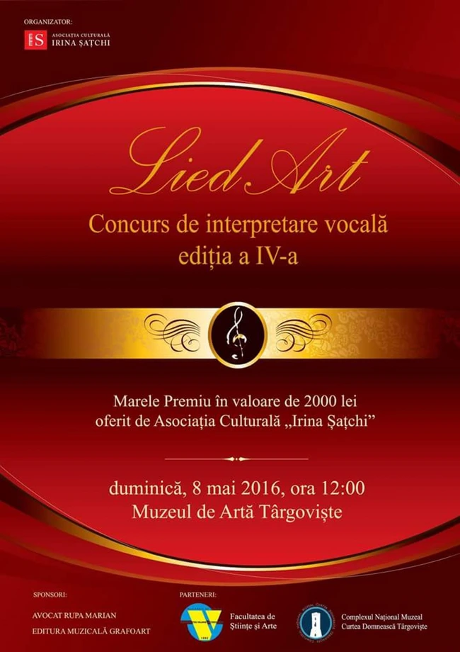 0Universitatea Valahia Târgovişte, Facultatea de Ştiinţe, Muzeul de Artă Târgovişte şi Asociaţia Culturală ”Irina Şaţchi” organizează Concursul Naţional de Interpretare ”Lied Art”, ediţia A IV –A, Târgovişte, 8 Mai 2016. Concursul va avea loc la Muzeul de Artă din Târgovişte.