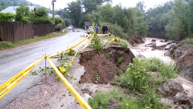 “Avem o porţiune de drum care este rupt şi mai sunt în satul Colibaşi două case unde terenul surpat a ajuns la 10-15 metri”, a declarat Vasile Breazu, primarul comunei Iedera.