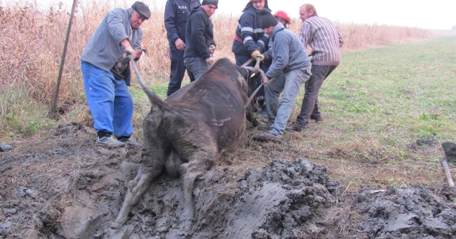 O vacă a fost salvată la limită de către pompierii dâmboviţeni. Proprietarul animalului spune că se întorcea cu animalul de la păşunat şi a scăpat într-un şanţ în timp ce încerca să bea apă. Interveţia a avut loc în satul Nisipuri din comuna dâmboviţeană Ulmi. Abia după 20 de minute vaca a fost scoasă din mâl.