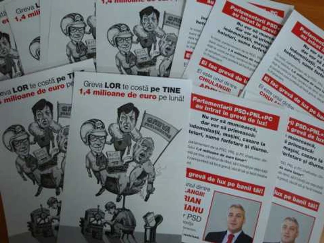Fiecare scară de bloc a fost ”dotată” cu asemenea flayere, în care se vorbește despre greva de lux a parlamentarilor.