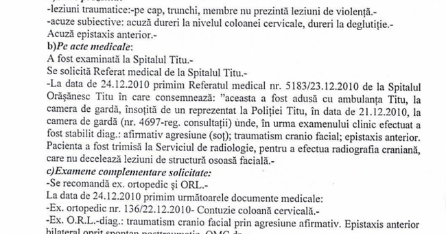 Fosta soţie a criminalului Florin Oprea a transmis presei un certificat medico-legal, întocmit de Spitalul din Titu în 2010, în care se specifică faptul că poliţiştii au însoţit-o pe femeie la spital după ce a fost bătută de soţ, aceasta având traumatism cranio facial şi epistaxis exterior.