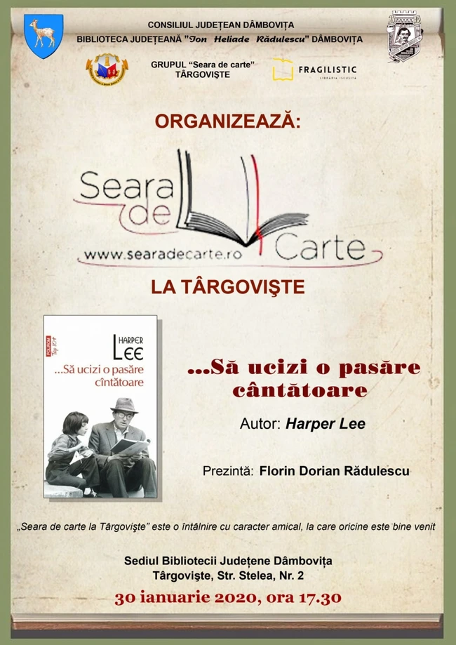 0Joi, 30 ianuarie 2020, ora 17.30, are loc o nouă întâlnire „Seara de carte la Târgovişte”, la sediul Bibliotecii Judeţene „I. H. Rădulescu” Dâmboviţa.