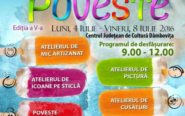 0Centrul Judetean de Cultură Dâmboviţa oferă şi anul acesta o opţiune inedită pentru vacanţa de vară. A 5-a ediţie a Taberei de Creaţie „O vară de poveste” va începe luni, 4 iulie şi timp de 4 zile va grupa ateliere de mic artizanat, pictură, icoane pe sticla, cusături, olărit.