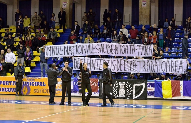Galeria echipei din Târgovişte a afişat un banner pe care scria ''Imnul naţional s-aude în toată ţara/Deşi e interzis de Lipă trădătoarea''.