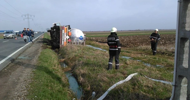 Şoferul de pe cisternă povesteşte că maşina a oprit prea brusc şi că nu l-a mai putut evita. Tone de motorină s-au scurs pe câmpurile agricole.