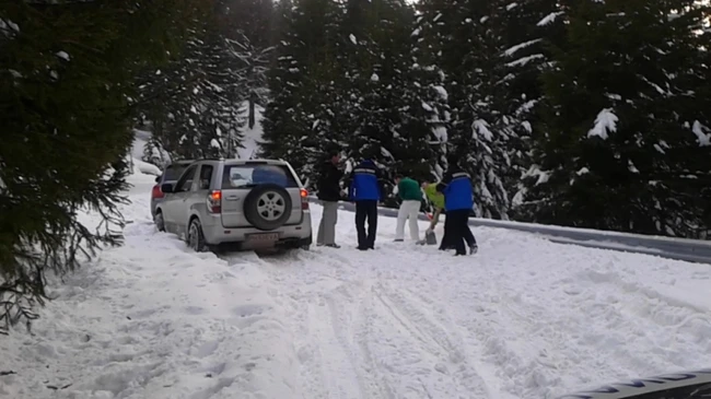 VIDEO O familie de argentinieni, împotmolită cu maşina în zăpada de un metru din Munţii Bucegi
