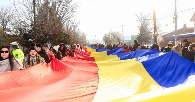 Participanţii au purtat un tricolor uriaş, în acordurile muzicii de fanfară.