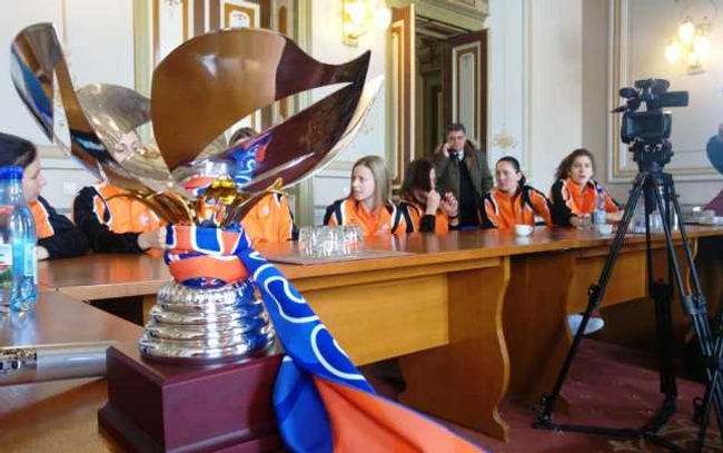 0Trofeul „Cupa României“ la baschet feminin, câştigat de CSM Târgovişte a fost prezentat jurnaliştilor la Primăria Târgovişte. Edilul, Cristian Stan, le-a felicitat pe jucătoare şi le-a oferit câte un buchet cu flori.
