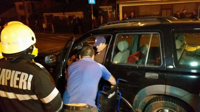 Soţia cântăreţului a fost încarcerată şi a fost nevoie de intervenţia lucrătorilor de la Inspectoratul pentru Situaţii de Urgenţă (ISU) Gorj pentru a putea fi scoasă din maşină (Foto: Radio Târgu Jiu). Femeia a ajuns la spital.