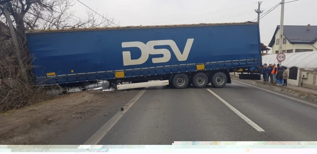 Circulaţie blocată pe Drumul Naţional 67, după ce un tir a derapat