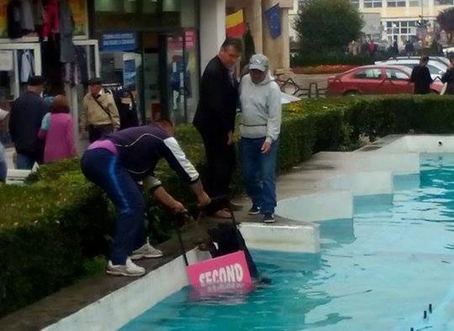 Un cetăţean a luat un suport publicitar de la un magazin din apropiere şi l-a băgat în fântâna arteziană pentru ca patrupedul să poată ieşi din apă. Inteligent, animalul chiar asta a făcut. S-a agăţat de suportul metalic şi a reuşit să iasă din fântâna arteziană, fiind ajutat şi de salvatorul său.