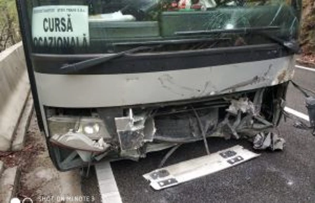 Impact între un autocar cu pelerini şi un autoturism Dacia Logan, lângă Mănăstirea Lainici
