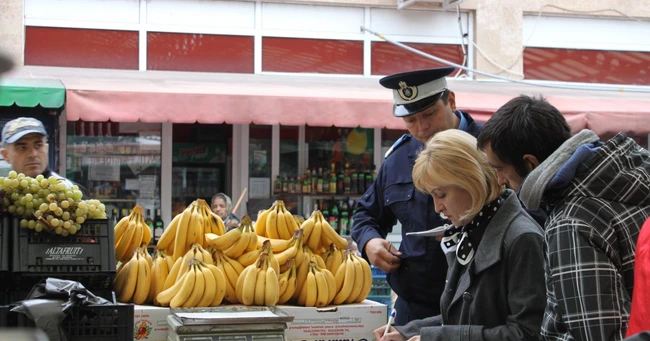„Urma să pun şi preţurile. Am pus bananele, strugurii, dar încă nu am pus etichetele”, a fost explicaţia comerciantului prins pe picior greşit.