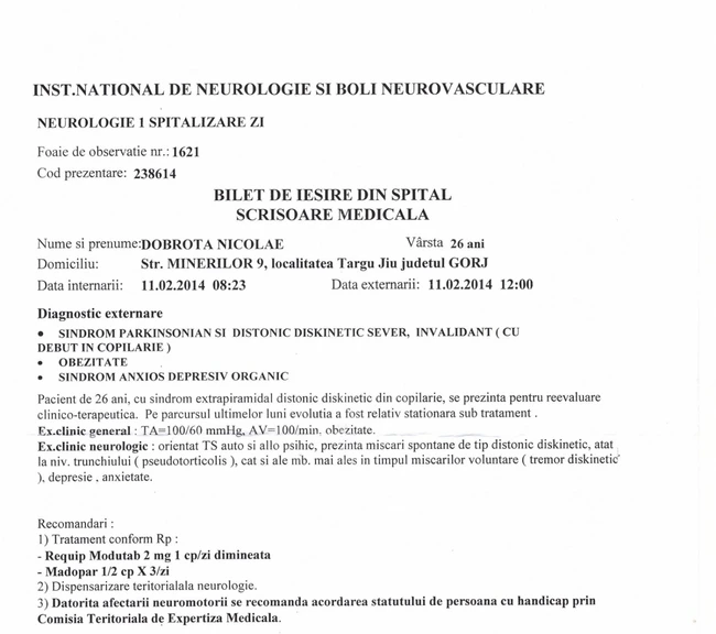 0Nicolae Dobrotă, în vârstă de 29 de ani, suferă chiar de la naştere de Parkinson, boală care apare, în mod obişnuit, la vârste înaintate. Diagnosticul a fost stabilit abia în urmă cu trei ani, după ce tânărul a mers din spital în spital pentru a afla de ce suferă.